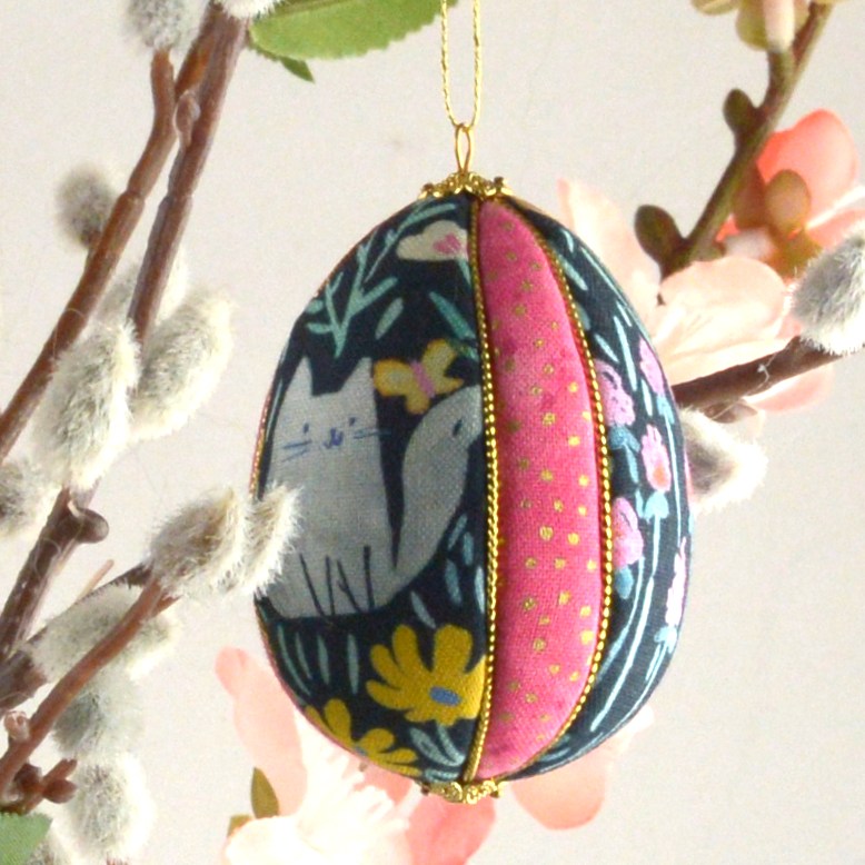 The pattern I used is a simple stripes pattern with 3 wider panels separated by 3 narrow stripes. I wanted to make sure the kitty fabric was used effectively, so I only put one cat motif on each egg. The other two panels are covered with the floral background only – and it looks just as cute! If you want to try making the same pattern, take a look at my how-to post “uneven stripes – 3+3” for step-by-step instructions.
