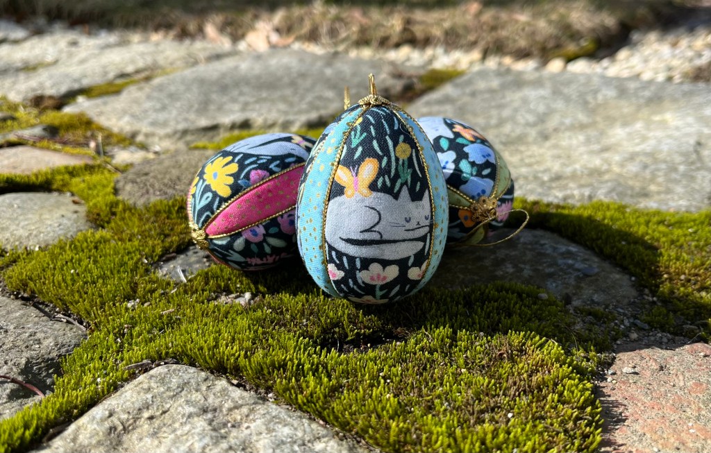 For a short time only, and in limited supply, I’ve got these adorable Whimsical Kitties egg ornaments up for grabs in my Etsy store! They come in sets of 3, one in each color: green, pink, and light blue, just like the ones in the picture. Want to make them yourself? Keep reading for more information about the fabric and a link to the pattern I used!